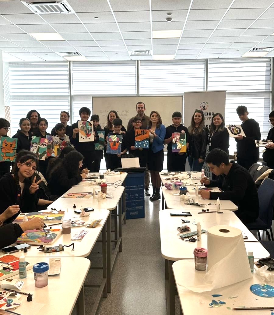 Ardından düzenlenen “E-Atıktan Sanata Atölyesi”nde öğrenciler, sökülen küçük elektronik parçaları tuvallere uygulayarak geri dönüşümün değer kazandırma sürecini deneyimledi.